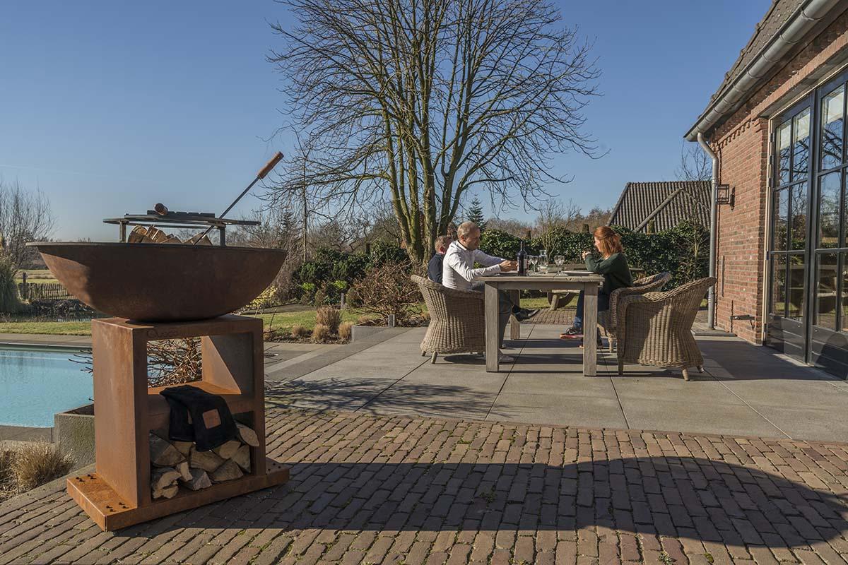 Mögen Sie Kochen im Freien für viele Personen und ist eine gemütliche Atmosphäre ein Muss für einen unvergesslichen Abend? Dann ist die extra large Ausführung des Quoco Piatto genau das Richtige. Sie hat eine Feuerplatte mit einem Durchmesser von nicht weniger als 130 cm. Die große Feuerschale erwärmt den massiven 10 mm starken Grillring, der als Teppanyaki Grill zur Zubereitung von köstlichen Gerichten dient. Der Piatto extra large ist ein hochwertiges Produkt, das nahezu unverwüstbar ist. Neben seiner breiten Anwendbarkeit als Außenküche, Designer-Grill oder Feuerschale ist es auch ein Prunkstück auf der Terrasse oder im Garten. Neben dieser Cortenstahl-Version ist sie auch in dunkelgrau-beschichtetem Stahl und in zwei kleineren Größen erhältlich. Dank der speziellen Luftzufuhr ist der Quoco schnell einsatzbereit und kann nach Benutzung einfach gereinigt werden. In den Fächern des Unterbaus ist Platz für beispielsweise Holz, Grillbesteck oder ähnliches. Stilvolles Grillen auf einem Designerstück!